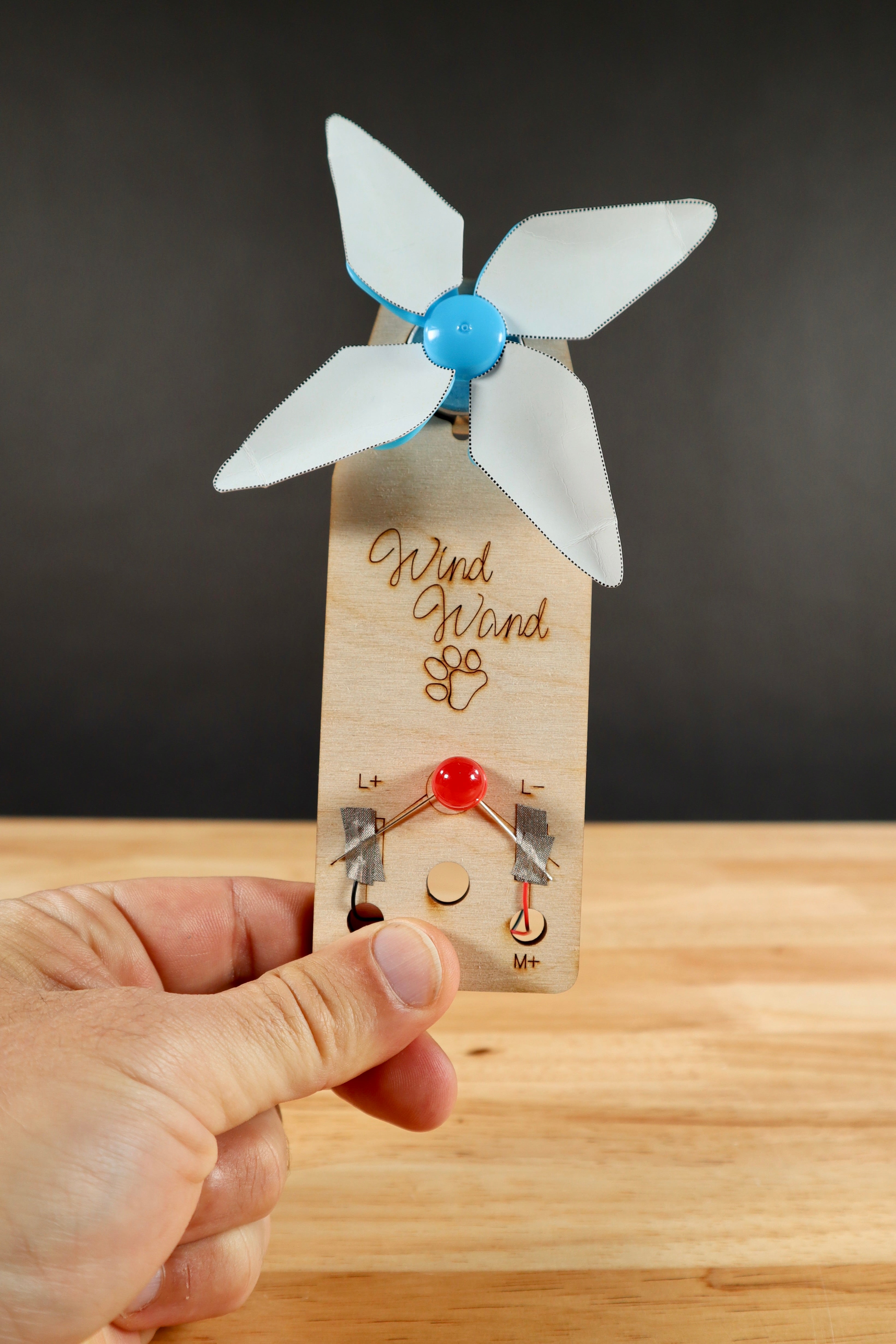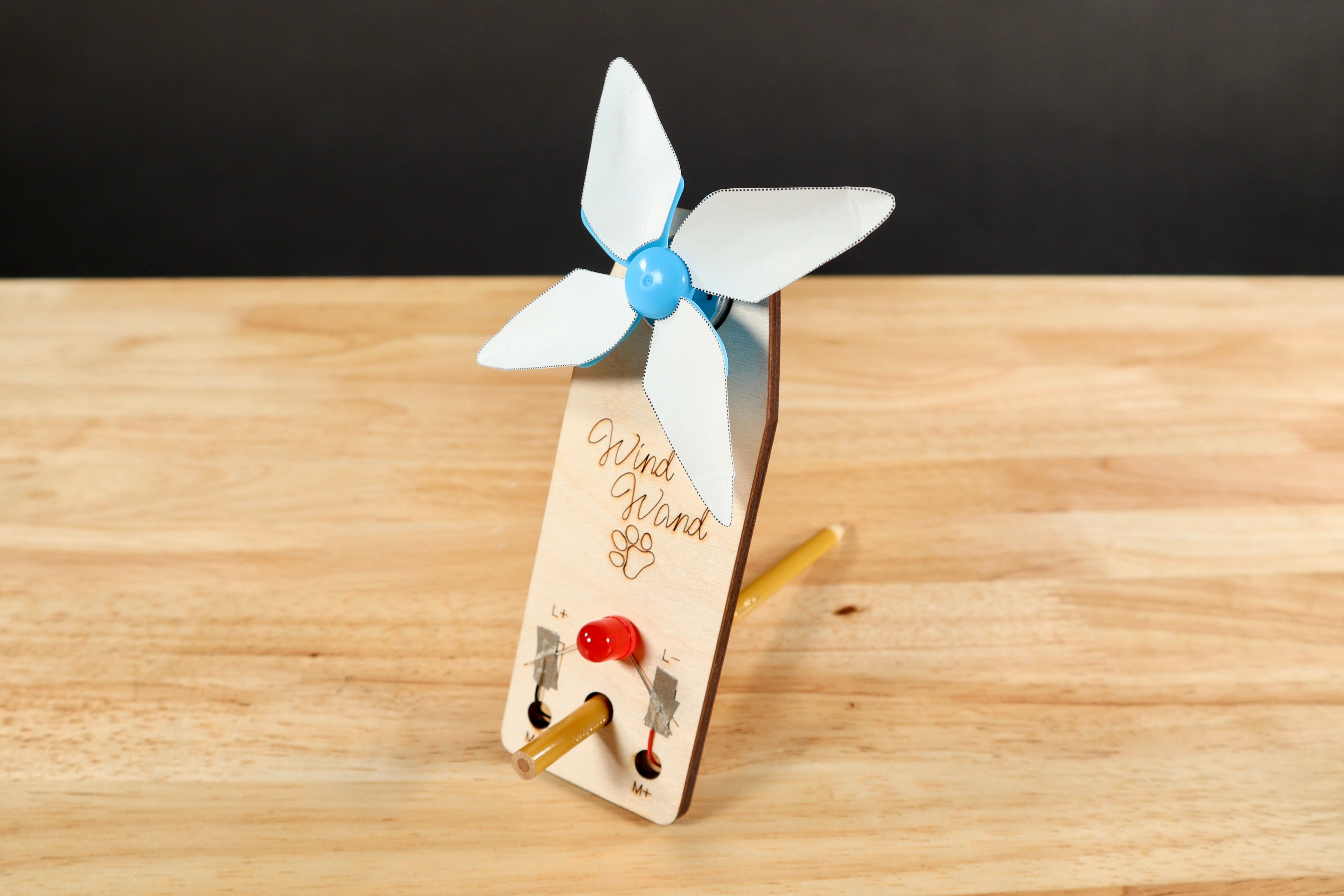 Turn on an LED with the power of Wind! All it takes is a strong blow and the fan turns, powering the LED. Use the included paper template to make additional fan blades, and see what happens. This project was designed as a simple 'Make and Take' project for younger students interested in learning about green energy. The entire project takes under five minutes to make and is perfect for ages 10+. All materials needed to build the Wind Wand are included, and only tool needed to build it is a pair of scissors.